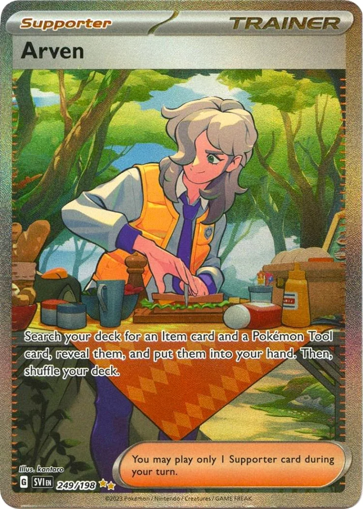 Arven je známí trenér pokémonů, na této kartě jej vidíme v nádherné special illustration rare, alternate full art verzi ze série Scarlet/Violet.