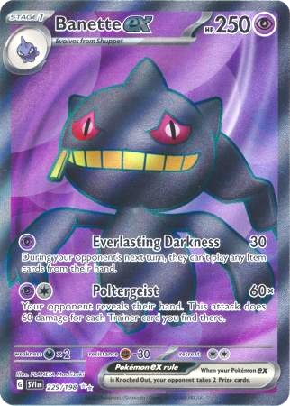 Banette patří mezi pokémonní duchy, jedná se o pokémona ze 3. generace. Tato karta se řadí mezi nádherné full art ultra rare karty ze série Scarlet Violet.   celý popis