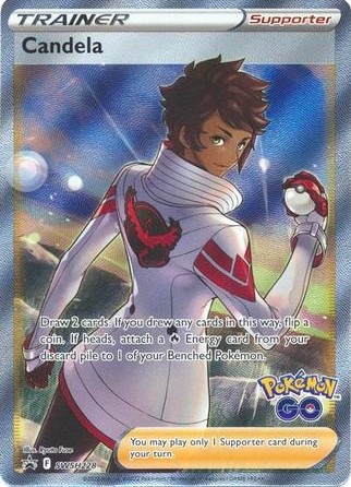 Candela je šéfka týmu Valor, který má ve znaku legendárního Moltrese. Tým valor se specializuje na ohnivé pokémony.
