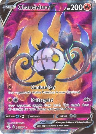 Chandelure je jeden z nejsilnějších duchů, který se objevil v 5. generaci pokémonů.  Tato karta spadá do kategorie ultra rare, full art, a lze ji nalézt pouze v sérii Fusion Strike. celý popis
