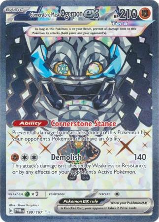 Ogerpon je legendární pokémon 9. generace. Jedná se o pokémona, který dokáže měnit svůj typ podle toho jakou masku nosí. Když nosí Cornerstone masku tak patří mezi ocelové a kamenné pokémony. Jedná se o ultra rare shiny kartu ze série Twilight Masquarade.   celý popis