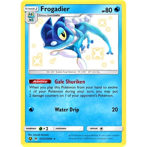 Frogadier je pokémon 6. generace. Patří mezi vodní typy. Jakmile má tento pokémon dostatek zkušeností vyvine se v silného pokémona Greninja.  Tato secret rare karta patří do speciální edice Hidden fates. Tato edice již dnes není běžně k zakoupení.   celý popis