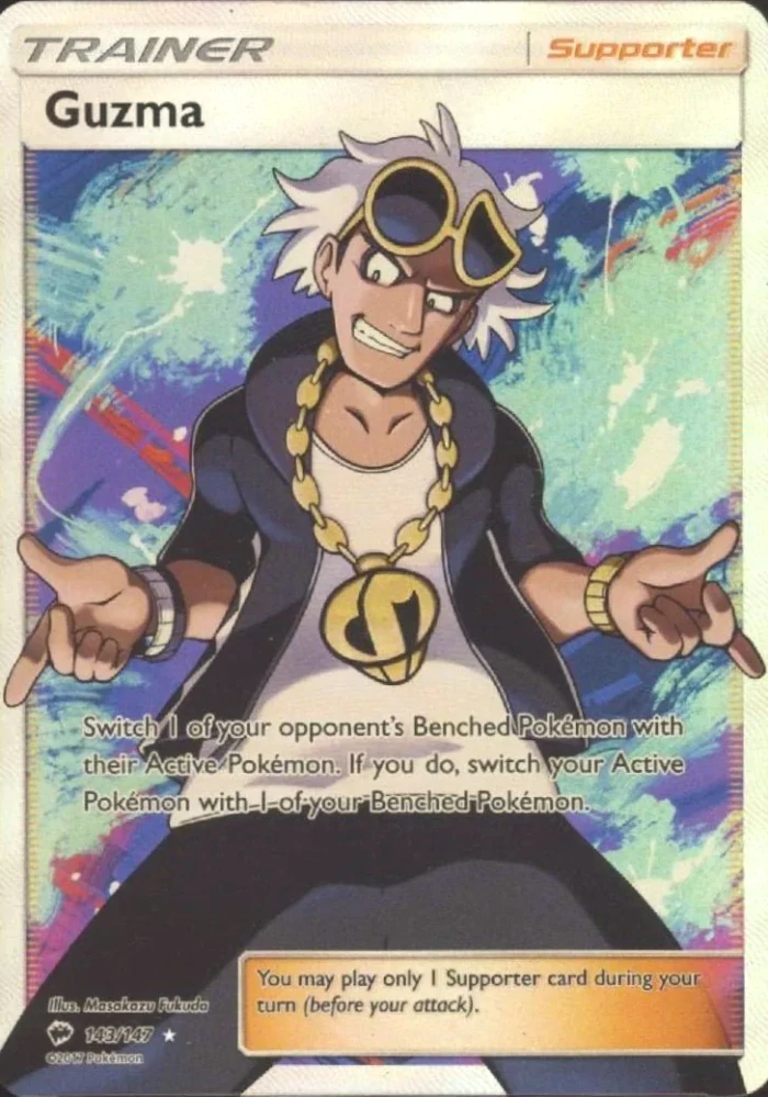 Guzma full art ze série Burning Shadows, z roku 2017. Tato karta se již dnes nedá běžně koupit.