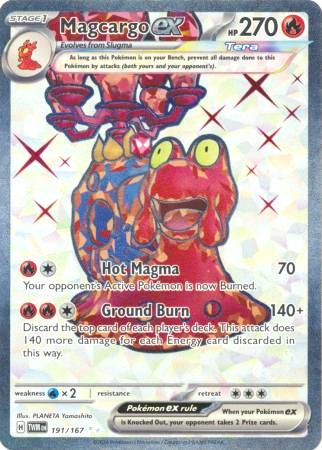 Magcargo, tento "ohnivý šnek" je pokémon 2. generace, patří mezi lávové pokémony. Tato karta spadá mezi ultra rare ze setu Twillight Masquarade. celý popis