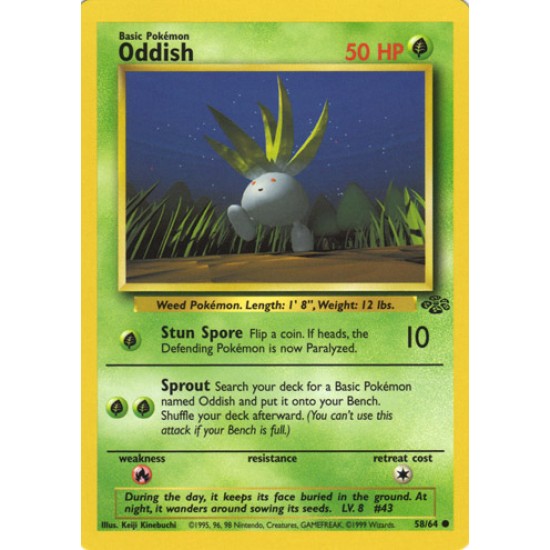 Oddish patří mezi travní a jedové pokémony. Objevil se již v 1. generaci pokémonů. Víme o něm, že je to "noční tvor, který přes den spí, pokud zápasí tak nejdříve protivníka ochromí a pak z něj vysává životní energii."
