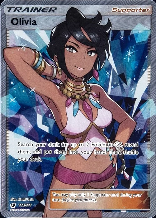 Nádherná trenérka Olivia, ve své full artové podobě ze série crimson invasion. Karta se již dnes nedá běžně zakoupit, pochází z roku 2017.