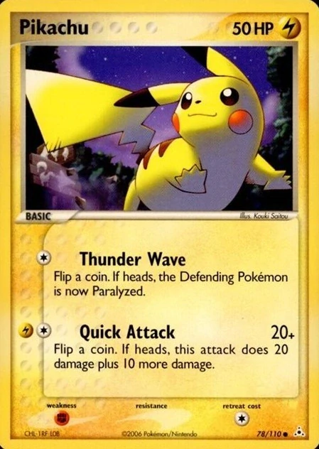 Nejznámější pokémon všech dob, Pikachu se řadí mezi myší, elektrické typy. Tento pokémon, je znám pro svoje silné elektrické výboje a velkou roztomilost, z tohoto důvodu je také často chován lidmi.