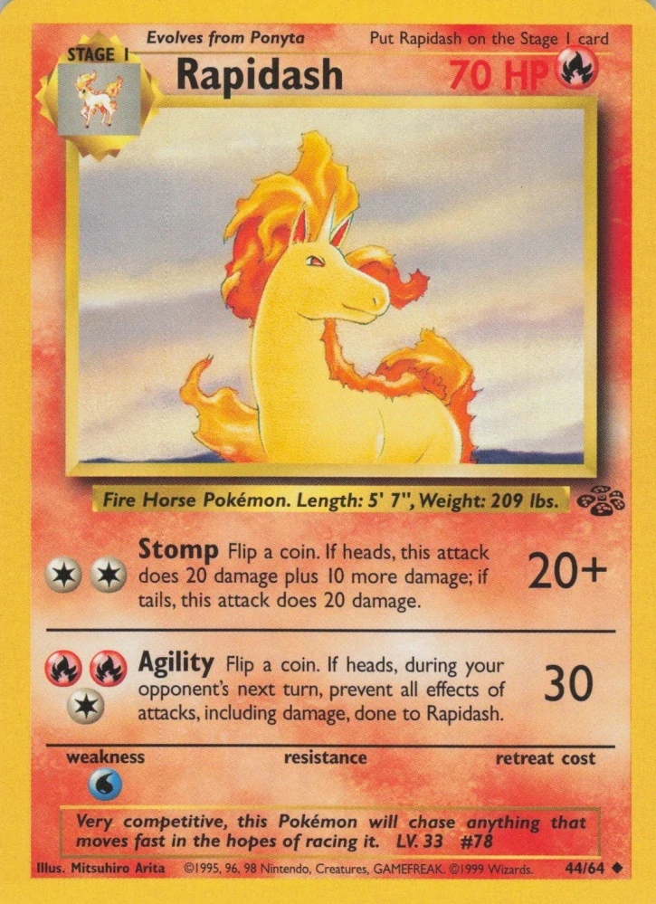 Rapidash patří mezi pokémony 1. generace. Běžně se vyskytuje jako ohnivý typ. Považuje se za jednoho z nejrychlejších pokémonů.