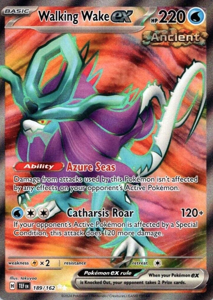 Walking wake, je pokémon vodního a dračího typu, jedná se o prastarého pokémona, který je příbuzný s legendárním pokémonem Suicune. Prastaré pokémony, lze poznat tak, že na kartě mají v pravém horním rohu značku Ancient.