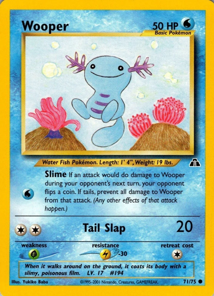 Wooper je vodní pokémon druhé generace. Rád se schovává na dně moří a díky výrustkům na hlavě se také dobře maskuje.